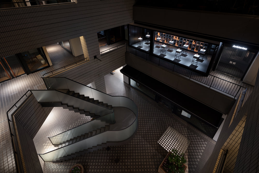 建物中央に吹き抜けがあるAXISビル、その特徴を活かしながらAmbientecの製品の魅力を存分に伝える場所となることを目的として設計しました。吹き抜けに面したガラス貼りのエリアはオリジナルでデザインしたモジュール什器を採用し、全製品が陳列されたギャラリーとして計画。展示スペースであるとともに、外から見た際にたくさんの標本箱が並んでいるようなAmbientecならではのファサードとなるデザインとしました。