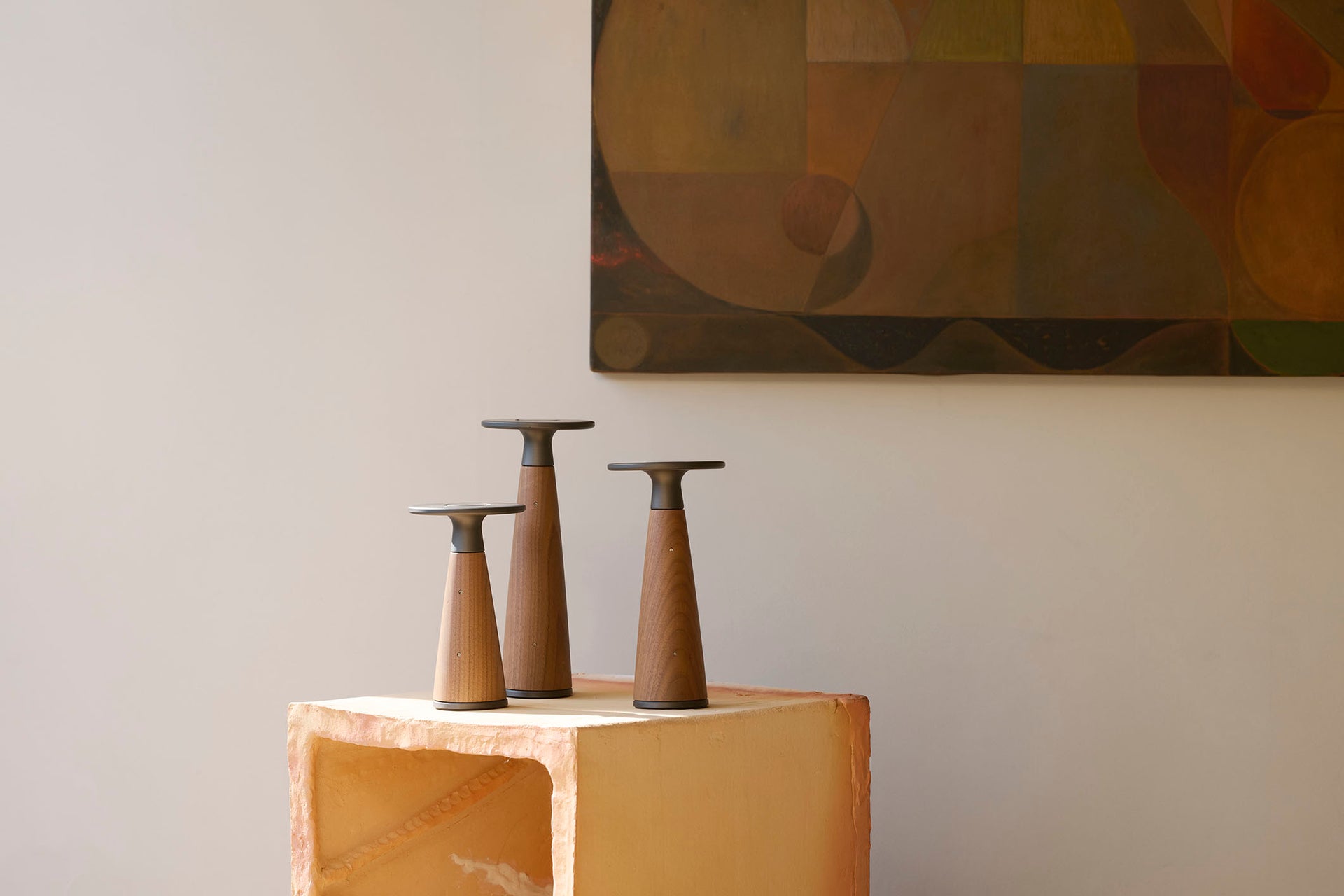 用途やシーンに合わせて、中心の木の部分を大・中・小の3つのサイズに切り替えられるほか、メープル、ウォルナットの2種類の木材から選ぶことができ、長く使い続ける中で交換することも可能です。使う人の暮らしが変化しても、ずっと寄り添い続ける光でありたい。そんな想いを込めたデザインです。