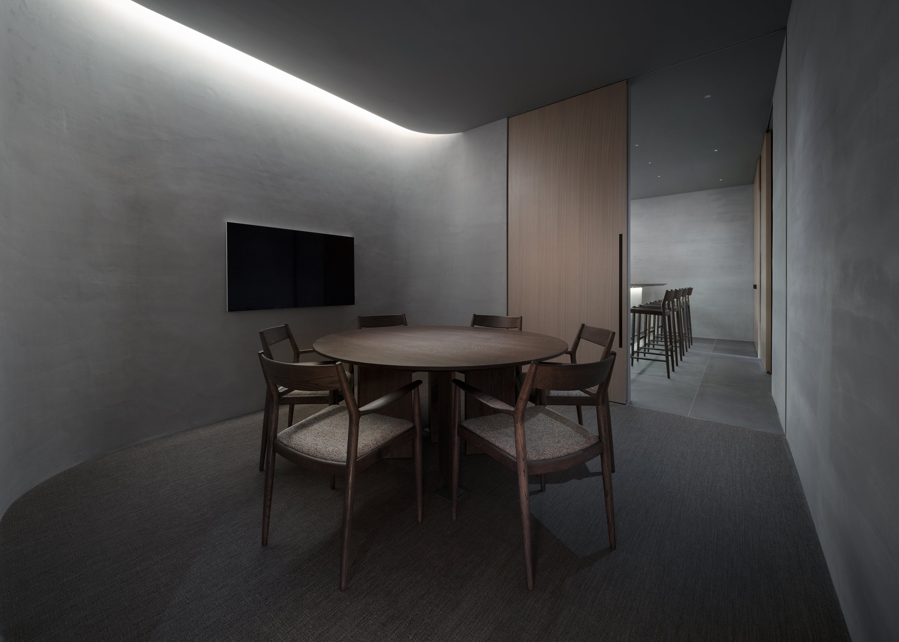 Behind it are two rooms with a soft feel, finished with textured materials such as plaster and wood. A high counter and a dining-style circular table are placed in the space, creating a relaxed atmosphere where customers can experience the products in action.