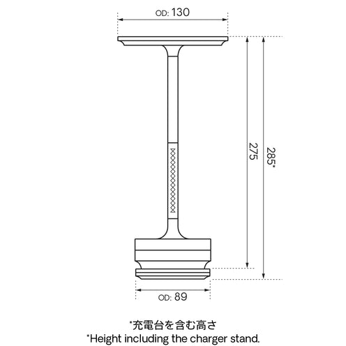 - Outer diameter: approx. 130 mm (Φ) Height: approx. 275 mm (main body only), approx. 285 mm (including charging stand)
